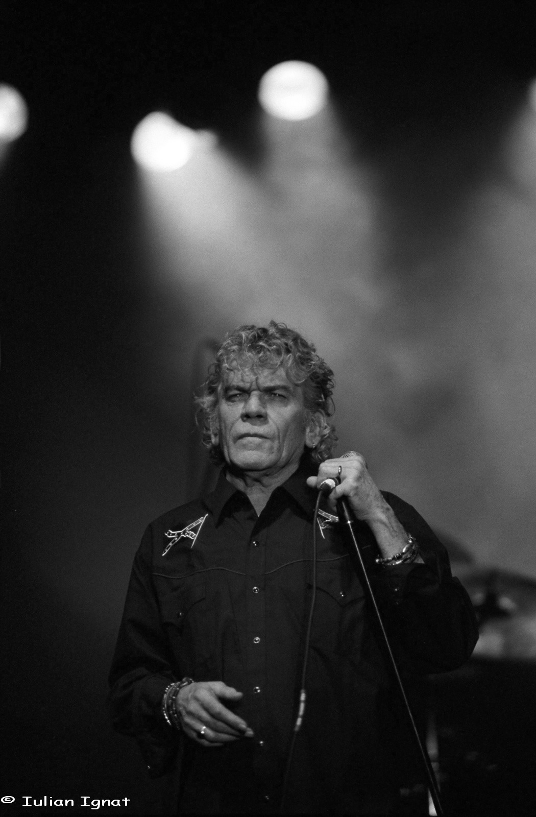 La începutul lui 1990 apăruse o broşură, “Giganţi ai muzicii rock”. Eu şi cu prietenul Şerban eram înnebuniţi după ea, o ştiam din scoarţă-n scoarţă, o deschideai la orice pagină, spuneai două cuvinte, iar restul continuam noi, cuvânt cu cuvânt. Pe atunci nu ştiam cum arată tipii din acele trupe, abia dacă ascultasem câteva piese care ne înflăcăraseră imaginaţia, iar în broşură, fiecerei litere a alfabetului îi revenea o trupă, cu discografie şi istorie. Prima trupă mare pe care am văzut-o în concert, în 1993, a fost cea de la “N”: Nazareth. Am mers cu Şerban şi cu Mihnea la Polivalentă, nu aveam bani de bilete şi am tot dat târcoale sălii. Eu cu Şerban am tulit-o pe o uşă, cu paznicul fugind după noi pe un hol beznos, ne-am ascuns sub o masă, şi când a trecut pericolul, am ieşit undeva în spatele scenei. Acum, Mihnea organizează concertul Nazareth din această seară de la Hard Rock Cafe. Fotografia-i făcută la al doilea concert al lor în România, acum 2-3 ani, un concert grozav până ce s-a stricat instalaţia de sunet de la Hala de Muzică.