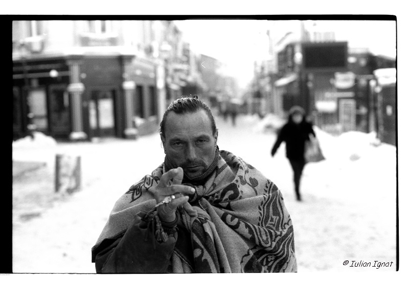 În prima dimineață a Noului An nu am mai dat de petrecăreți întârziați, ca până acum,nu am mai avut parte de întâlniri de marcă. În centru părea o dimineață obișnuită de duminică. Cu un an în urmă, prin Centrul Vechi, am auzit niște sunete ciudate și am zărit o creatură în josul unei străduțe. Când m-am apropiat am văzut că era un bărbat cu o pătură pe cap. Și-a descoperit capul, a pornit și m-am luat după el, căutând să intru cumva în vorbă cu el. A dat cu piciorul zdravăn într-o sticlă de pe jos și i-am remarcat pantofii cu botul lung, nu tocmai potriviți pentru ger. Mi-ar fi înghețat picioarele în cinci minute în așa ceva. Asta cred că a durut, i-am zis. Omul a zâmbit, dar n-a zis nimic. Am continuat să mergem împreună, eu m-am spuneam câte ceva, el nimic. Dar am simțit că e-n regulă să-l fotografiez, cumva ne împrieteniserăm. Apoi a început să vorbească. Scotea sunete ca de pasăre, nu articula nici un cuvânt, vorbea ca un pescăruș. Îmi place să cred că avusese o noapte grea, că nu vorbea mereu așa. La o intersecție ne-am îmbrățișat și și-a văzut fiecare de drum. Nu l-am mai văzut de atunci.